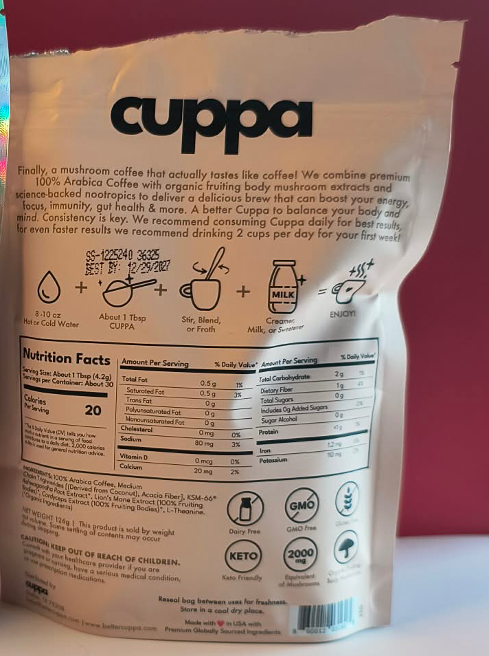 Cuppa is closer to what I expected from a mushroom coffee. It drinks like a gentle medium roast with a noticeable mushroom note. I enjoyed it, but longtime coffee drinkers might need a little time to warm up to that flavor.