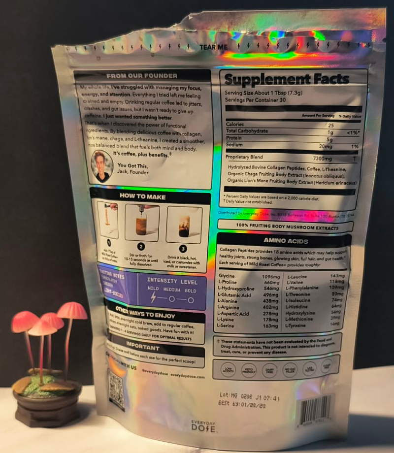 Everyday Dose keeps the formula simple: Real coffee, two mushrooms, collagen, and L-theanine. Lion’s mane handles brain and immune support, while Chaga supports the gut and digestion.